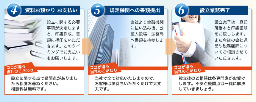 役員と株主となる方の個人印鑑証明書の取得、会社実印の作成、資本金のご自身の銀行口座への振込み、この3点です。ご依頼いただいた場合、この3点についても詳細にご説明をさせていただきます。