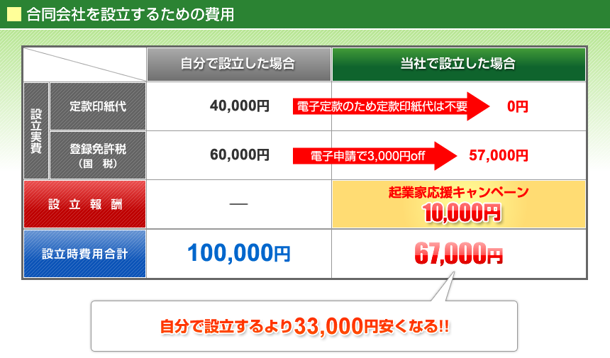 またご自身で手続きを行うと、定款の電子認証を受けることができませんので、専門家に依頼するよりも、印紙代4万円を余分に負担することになります。当社の税務顧問パックの報酬は4万円ですので、実質負担なしで会社が設立が可能です。